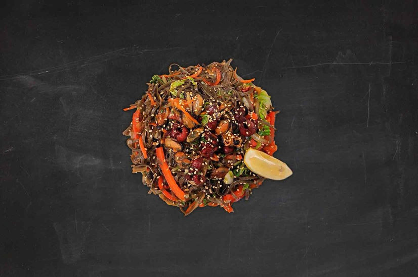 Гречана локшина, болгарський перець, морква, спаржева квасоля, соус теріякі, соус sweet chilli, соєвий соус