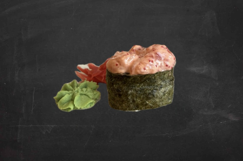 Сяке спайсі гункан — це гункан-суші, де подрібнений лосось змішують із пікантним соусом і викладають на рис, обгорнутий норі. Гострий соус додає страві насиченого смаку, гармонійно підкреслюючи свіжість лосося.