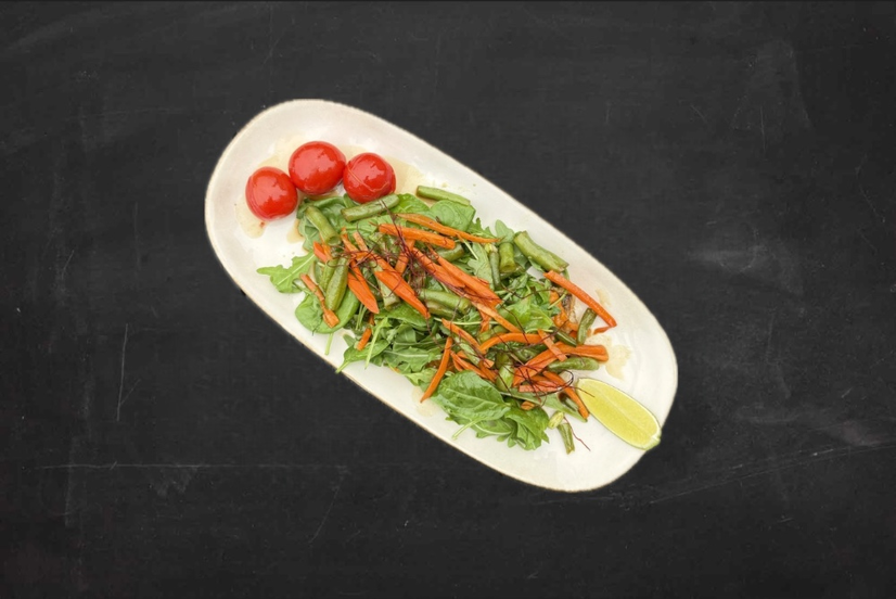 Філе дорадо, перцеве песто, морква, листя салату, спаржева квасоля, чері, лайм, нитки чилі