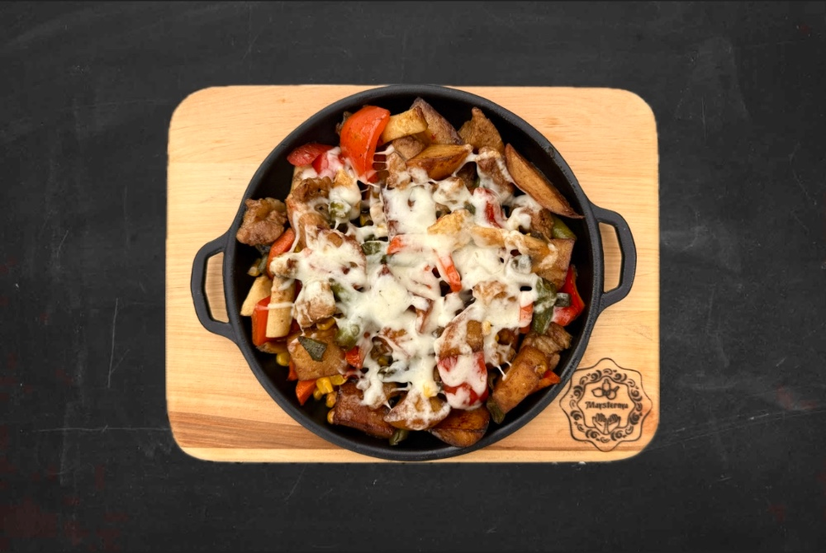 Картопля, свинина, шампіньйони, спаржа, морква, болгарський перець, кукурудза, сир Моцарела, соус sweet chilli, соєвий соус