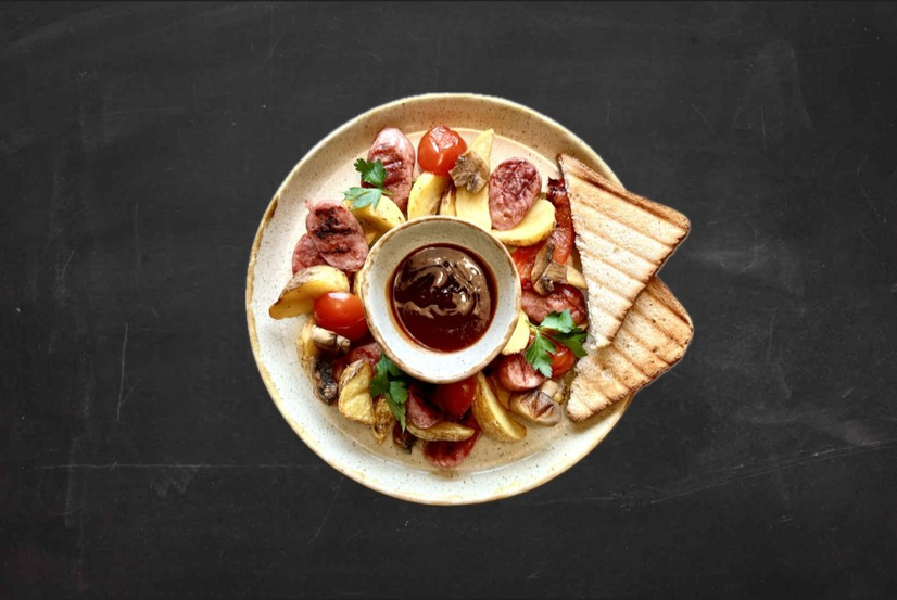 Шашличні ковбаски, картопля, перець болгарський, кабачок, шампіньйони, помідори, соус барбекю