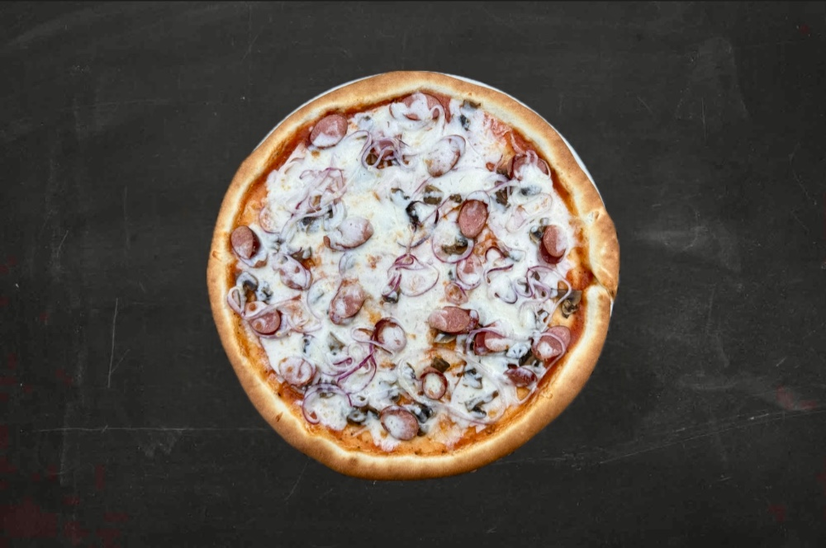 Мисливські ковбаски, шинка, шампіньйони, цибуля, помідори, томатний соус