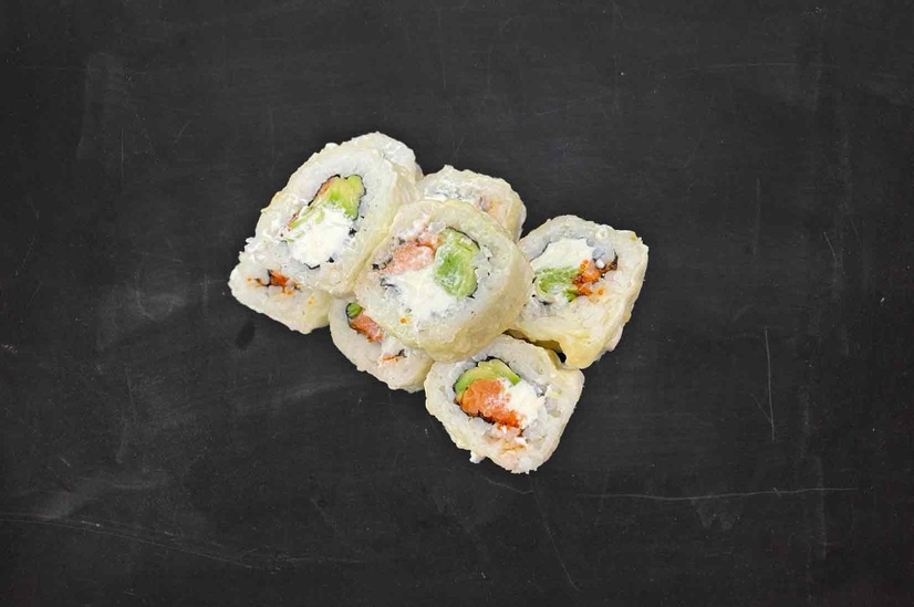 Авокадо, сир, ікра тобіко, кляр. Лосось, або вугор, або тунець, або креветка, або сніжний краб