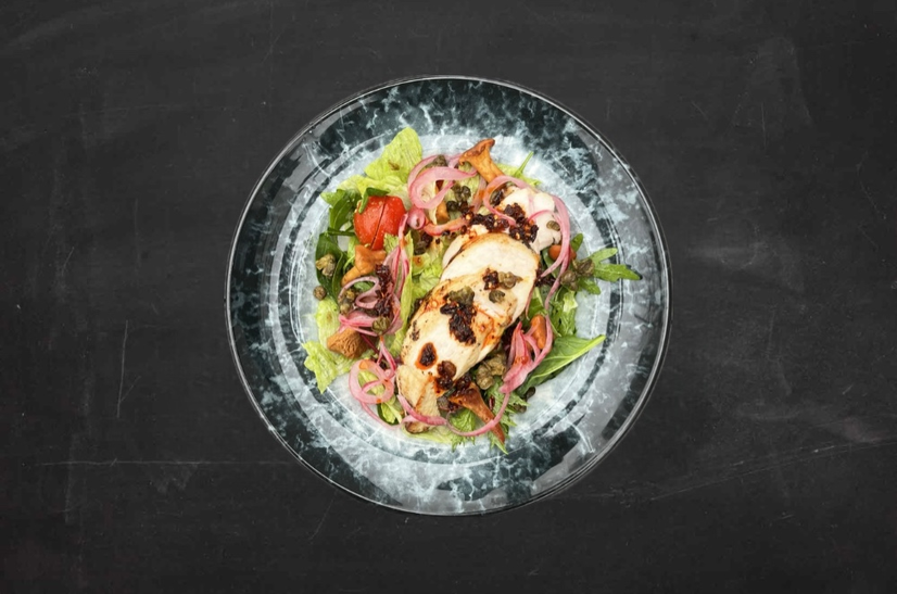 Куряче філе, гриби лисички, помідори чері, каперси, листя салату, салат айсберг, маринована цибуля, соус песто, соус хо