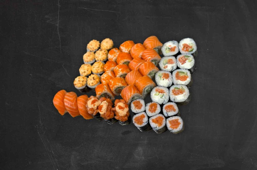 Планета макі, Сяке макі, Філадельфія, Каліфорнія в ікрі з лососем, Окінава з лососем, Сяке нігірі 3шт, Сяке спайсі гункан 3шт