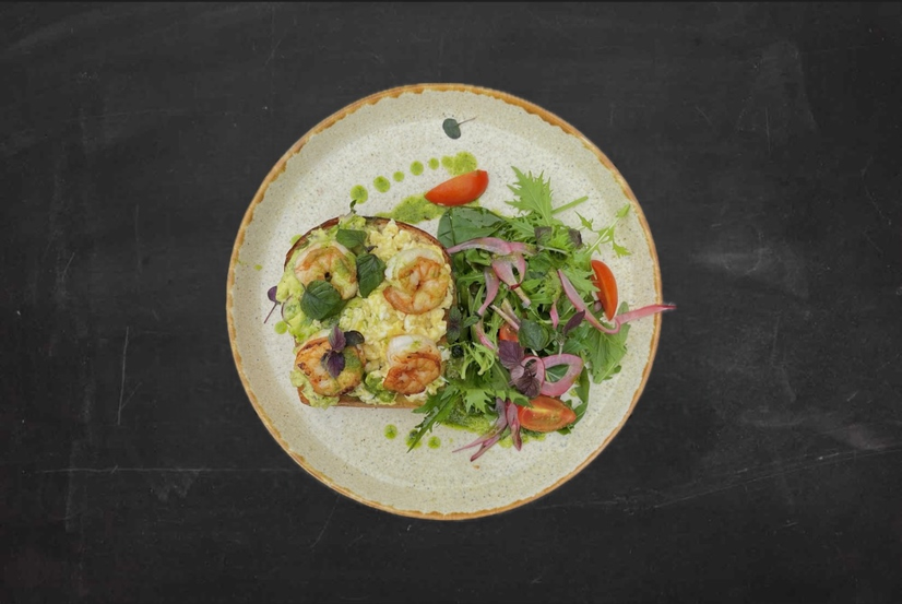 Хліб Бріош, креветки, гуакамоле, соус песто, чері, листя салату, маринована цибуля