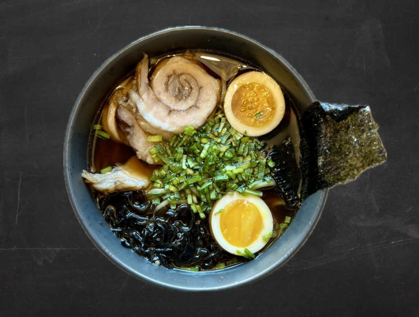 Бульйон рамен, мариноване яйце, свинина, норі, зелена цибуля, деревний гриб, локшина